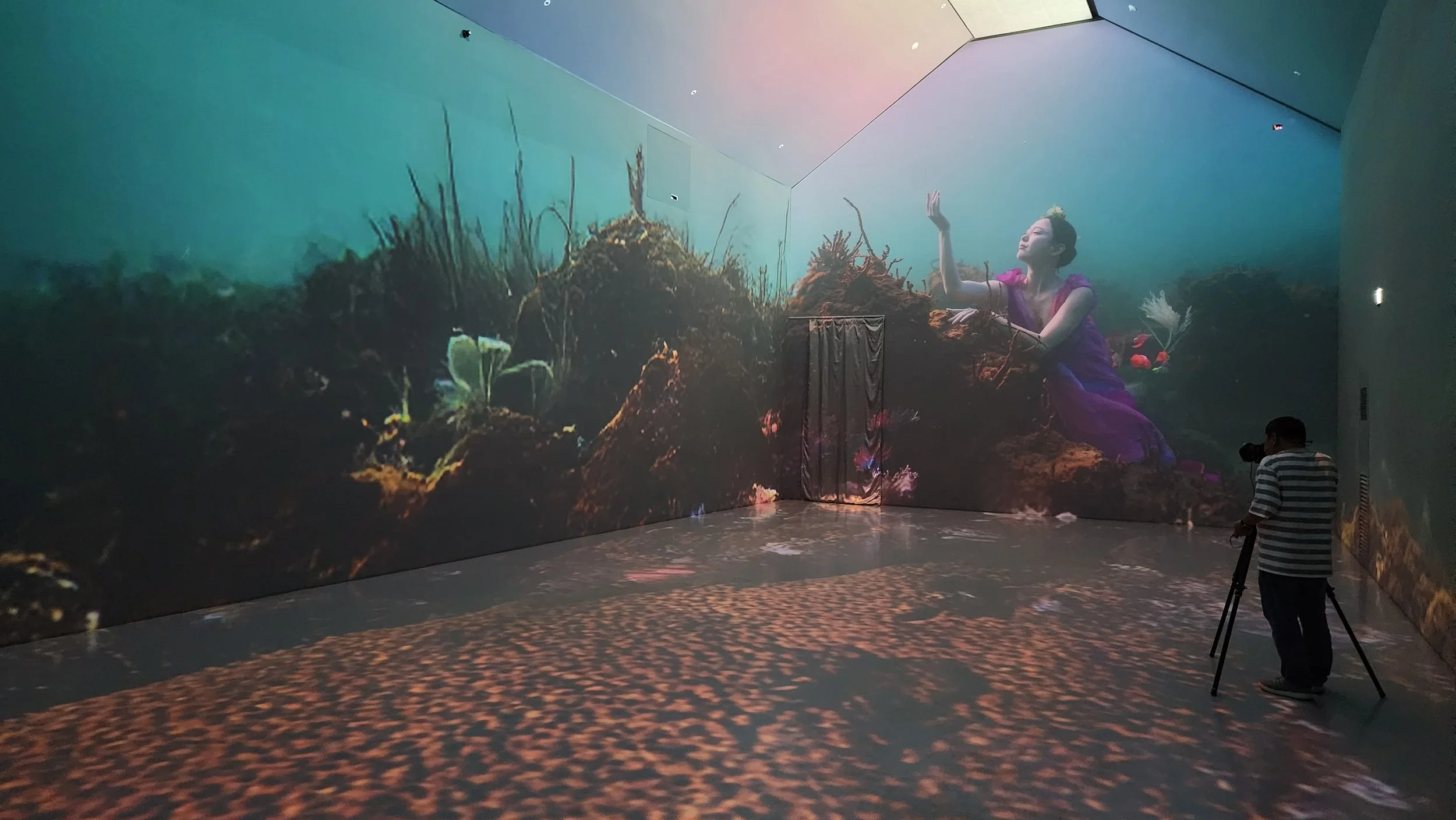 Within this structure, the Flower Maiden moves in slow, suspended gestures, guiding the young haenyeo, Biyang, through a field shaped by tide, depth, and time. Extending the language of painting into the sea, the work transforms pigment into a living surface—where paint skins become organism and image dissolves into water.