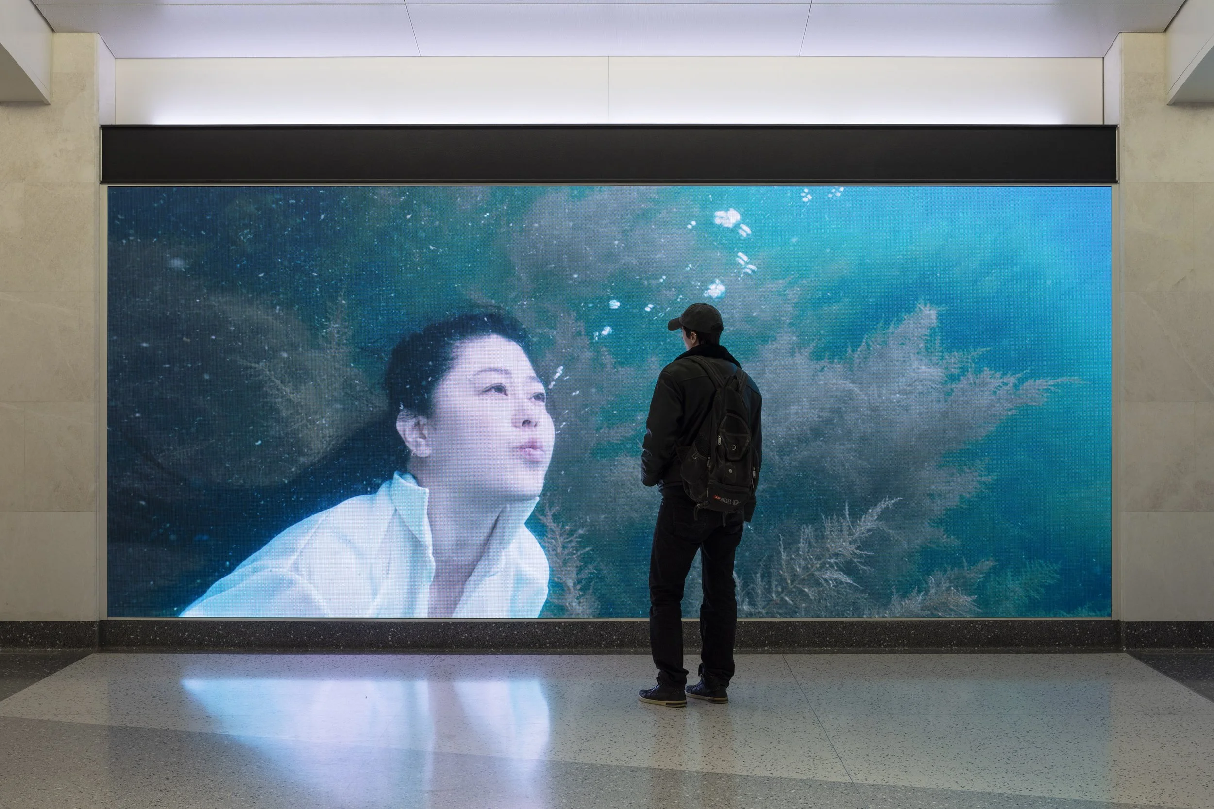 Breathe with Me is a five-channel video installation commissioned by MTA Arts & Design and presented at Grand Central Madison Terminal. Filmed underwater, the work follows performers as they walk, balance, reach, and release breath in slow, deliberate rhythms—transforming simple actions into gestures of endurance and connection. Displayed across synchronized screens in a public transit hub, the installation contrasts the urgency of commuter movement with the stillness of submerged bodies. This shift in tempo invites viewers into a moment of pause, where breath becomes both a shared biological act and a point of connection. Working through water as both medium and condition, Breathe with Me reflects on vulnerability and interdependence—how bodies persist, together and apart, within larger ecological systems.